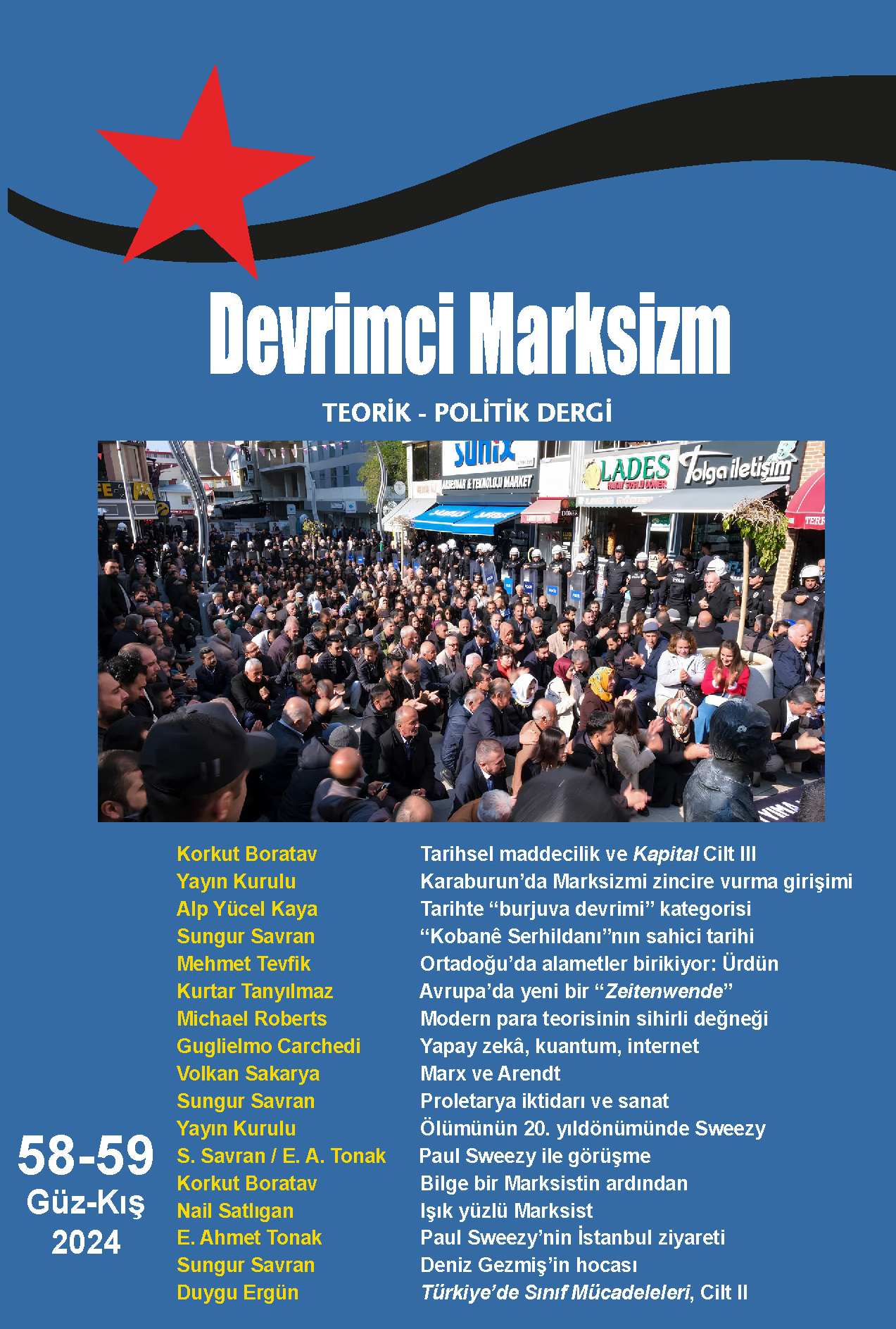 Kaya’nın yazısını üç ayrı güncel siyaset yazısı izliyor. Bilindiği üzere yeni geride bıraktığımız 2024 yılı, Ekim 2014’te Kobani dolayısıyla yaşanan halk isyanının 10. yıldönümü idi. Bu olaylar, son dönem tarihimizde, kendisinden yaklaşık bir yıl önce yaşanmış olan Gezi halk isyanı ile birlikte çok önemli bir yer tutar. Ne ilginçtir ki, 10. yıldönümünde Kobani isyanı hemen hemen hiç tartışılmamış, hatta haber olarak bile sadece burjuva medyasında yer almıştır. Sungur Savran, geçen yıl 53-54. çift sayımızda yayınlanan Gezi isyanı değerlendirmesinden sonra, bu sefer, 10. yıldönümü vesilesiyle Kobani isyanını da irdeliyor. Savran, Kobani isyanı konusunda on yıldır “resmî tarih” tarzı bir anlatının yerleştiğini, devletin ve Kürt hareketinin birbirine paralel biçimde Kobani isyanını olduğundan daha önemsiz göstermekte birleştiğini öne sürerek bu anlatıya meydan okuyan delilleri ortaya koyuyor. Savran’a göre, Kobani isyanı Türkiye Kürdistan’ında tarih boyunca yaşanmış en büyük kitle hareketidir. Kürt halk kitlelerinin günümüzde nasıl devrimci bir potansiyel taşıdığını ortaya koymuştur. Hakkıyla incelenmelidir. Savran’ın yazısı “sahici” bir tarihe bir ilk adım olarak okunabilir.